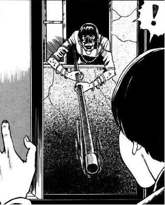 Tomie es una monstruosidad sin futuro y sin memoria que, por mala fortuna, puede enloquecer a cualquiera a su paso. Javiera Vega, en su ensayo sobre terror japonés moderno La otra orilla, comenta que esta mujer misteriosa, “si es ‘algo’, es caos maligno”, que es como si “fuera una fuerza que debe permanecer en el mundo a como dé lugar” y que esta historia de Junji Ito “parece decirnos que siempre tendremos que convivir con aquello que nos aterra en el fondo de nuestras mentes. Aunque lo deseemos, nunca estaremos seguros de nuestros deseos más oscuros” (p. 57-58). De las ideas que propone esta autora, quiero quedarme con dos que, me parece, pueden extenderse a buena parte de la obra de Junji Ito: el caos inevitable y la convivencia con el horror. Uzumaki es un terror despersonalizado. Un pueblo es contaminado por espirales. Así, tal cual. Invadido por una maldición que, nuevamente, viene de ninguna parte. Los caminos, el pueblo, las personas, todo se deforma producto de una fuerza inexplicable. La obsesión no es solo de los personajes, es como si obsesión tomara forma en el mundo, como si dejara de ser una sensación y un concepto para ser una sustancia. El estilo de Junji Ito sostiene la perturbación del ambiente: primeros planos de los rostros, la mostración sin ascos de los actos más sanguinarios o las deformidades, el oscurecimiento sorpresivo de los rostros y los espacios cerrados, el sobrecargo de los paneles panorámicos, todo aporta a una ambientación siniestra y que no lo hace asco a lo explícito.