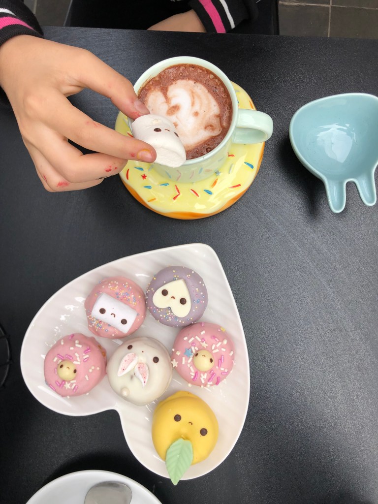 Emilia y yo estamos sentadas en una mesa para dos, un poco más allá, su familia disfruta de su propio desayuno. Cuando llegó nuestro pedido, le pusimos pausa a la conversación porque necesitábamos apreciar el diseño de los platos, las hermosas mini donas y el marshmallow sorpresa que incluyeron en el chocolate caliente. Llamamos a sus padres y sacamos fotos para inmortalizarlo todo.