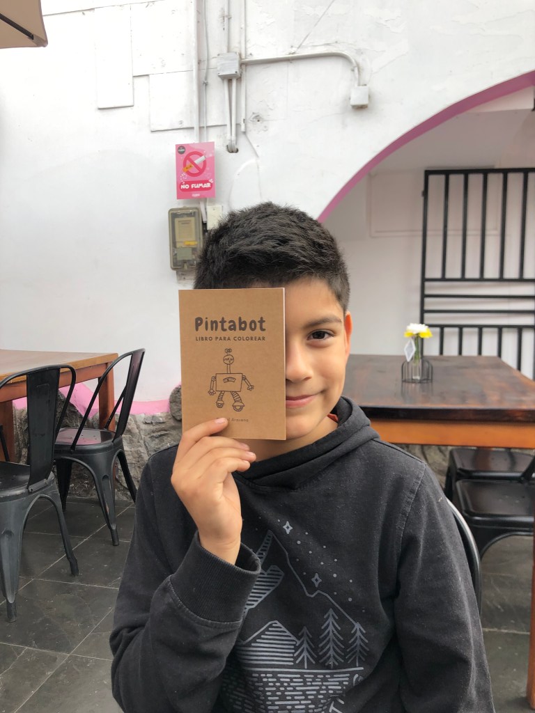 Sus impulsos creativos y el oficio editorial es algo que salta a la vista, poco a poco va sacando material: libros, tote bags pintadas por ella, stickers e imanes. Me regala algunas cosas y me vende otras, como Pintabot un libro para colorear que es parte de su catálogo, cuyo autor es Rafael Aravena, su hermano menor.